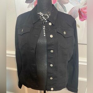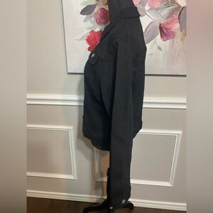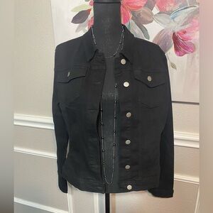 This black jean jacket features a structured design with a classic pointed collar and full-length sleeves. Its versatile style makes it a perfect addition to any wardrobe.