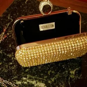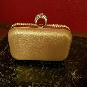 +Perfect condition with stones. Goldtone and black on the inside. Beautiful ring as a closing mechanism. Optional chain can be used as clutch or over the shoulder. Comes with dust bag, used once.