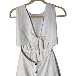 Peixoto Women's white cutout mini dress in size M. Features lace trim, adjustable tie front, and a stylish cutout design. Perfect for boho summer vibes. boho chic summer cutout mini dress white lace trim button front beach festival vacation casual