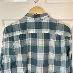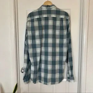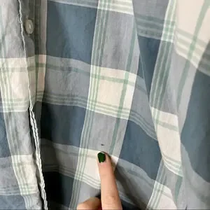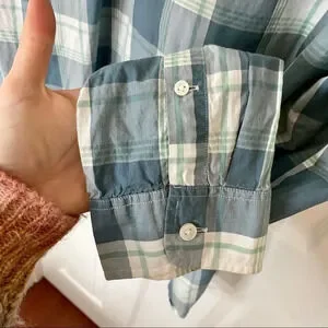 Features: Different shades of blue, white and green plaid shirt. Perfect to dress up for work or down for a casual date or day out. All buttons are attached and functional.