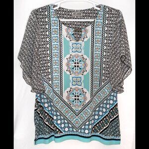 Fluttery JM COLLECTION XL Aqua, Turquoise & Black Batwing Sleeve Stretch Blouse