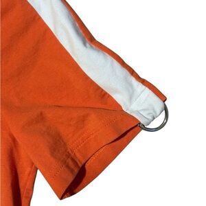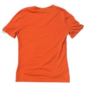 Cute and sporty stretchy orange tee from Escada. Gently pre-loved - looks brand new. White ringer neck with white stripe down the shoulders/arms. Silver buckles at the hem of each sleeve.