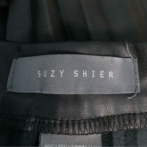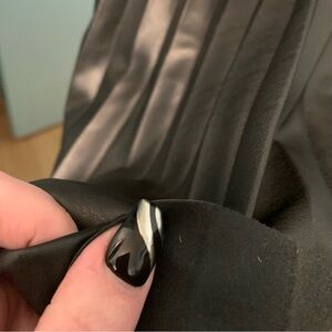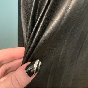 This black midi A-line faux leather skirt features elegant pleats that create a sophisticated and polished look, perfect for work or cocktail occasions. The pleated design adds texture and movement, making it a versatile addition to your wardrobe.