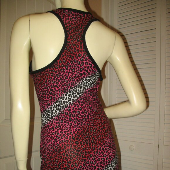 Vintage Y2K 90s 2000s Candies womens racerback micro-short mini bodycon shirt tank dress in multicolor (black with fuchsia pink and gray) animal print (leopard pattern) - women's micro-short dress or women's long top, sexy dress. Unique slanting/diagonal multicolor animal striped pattern print. In great condition, preowned, minor sign of wear. Material is 100% RAYON. Women's dresses great as casual wear, clubwear, club wear, clubbing attire, etc. Hurry! We only have ONE PIECE of this item!