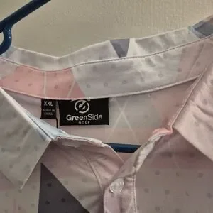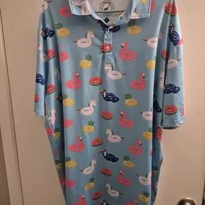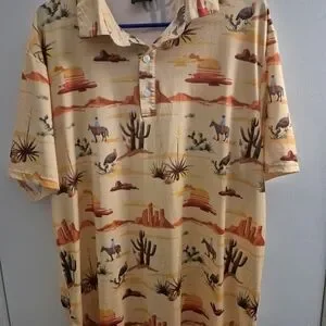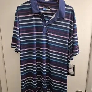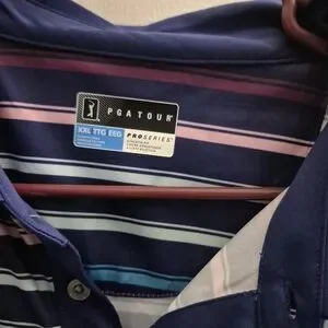 Five golf shirts in very good shape and one new with tags. Pga tour, hreski and proud 90 brands.
