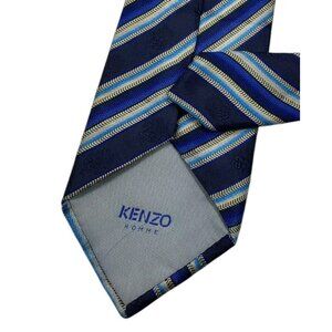 KENZO Men's 100% Silk Necktie LUXURY Tie Navy Blue Striped Floral W:3.7" EUC