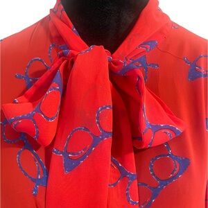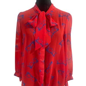 Red,blue eye glasses print, sheer,button down neck bow tie blouse, small