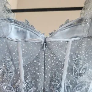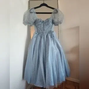 Stunning blue dress with intricate lace details. Features elegant puff sleeves and a flowing skirt. Perfect for special occasions, homecoming, or prom.