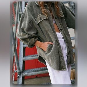 Stylish oversized shacket. Worn a few times. No signs of wear. Comes with distressing. Size small. Color is dirty olive.