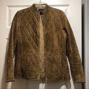 Tan, soft leather/suede jacket. Two zip pockets on each side and two inside pockets as well. Zipper track is broken but could be repaired but jacket is super cute open! Rounded collar. Great condition. Pit to pit 18in, shoulder to bottom 26in, arm length 23in.