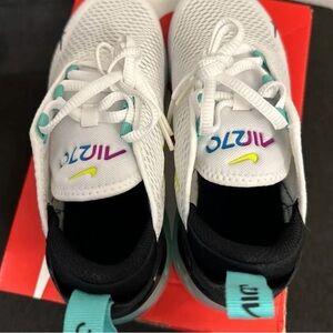 Nike Air Max 270 sneakers with a white mesh upper. Features yellow and teal accents. Stylish and comfortable design.