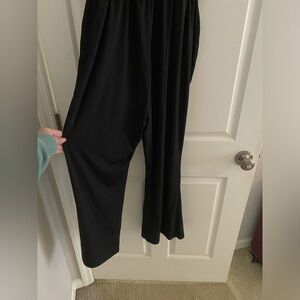 Stretchy fabric, elastic waistline, very flattering. Has a snap to adjust from very deep V neckline to more modest neckline (see photos)