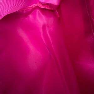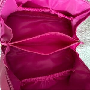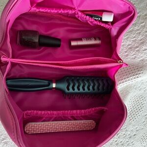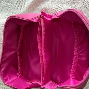 Maison bright pink cosmetic bag with gold tone zipper and handle buttons. Opens accordion like with middle interior zipper pocket, two big compartments and small elastic ones on the side. (cosmetics for scale only).Spotless except for one ink mark about an inch long - in picture. No odors-smoke free home. Perfect for travel.