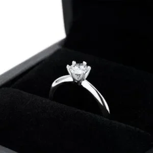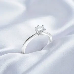 Moissanite gemstone (0.42 CT, DEF-color, round brilliant cut); Sterling silver with Rhodium plating