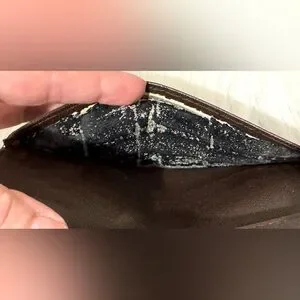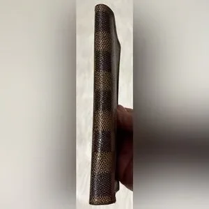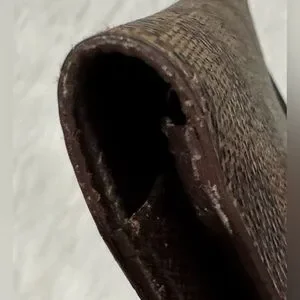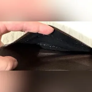 No marks on checkerboard exterior. Three card slots and two compartments. Marks on card slots. Rubbing and peeling in compartments. Wear and separation on corners. Overall, in good used condition. Price is reflective of where and enables you to own a piece of luxury at a fraction of regular retail!