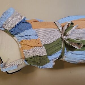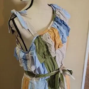 Embrace elegance with this striped one-shoulder dress. Featuring a blend of blue, green, and tan hues, it's perfect for any occasion. The ruffle detail adds a touch of femininity.