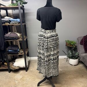 Cotton black and white full skirt all over pattern gauzy. Very lightweight full length skirt. Flowy and beautiful pattern with florals, paisleys, and fish. Drawstring waist.