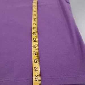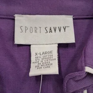 This is a women's Sport Savvy top, featured on QVC, in size XL, with a V-neck collar, short sleeves, and a pullover style. The top is in a lavender color with white trim accents, made of 95% cotton and 5% Spandex jersey fabric. It has a casual sleeve type, a regular fit, and is suitable for travel and casual occasions. The top is designed with a sporty theme and features stretch for added comfort.