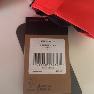 This new with tags orange North Face jacket has 2 outside pockets, 2 inside pockets, 1 arm pocket. Removable hood. Nice & warm. Size large. Length hits me just above mid thigh & I’m 5.5’. Please ask any questions before buying.