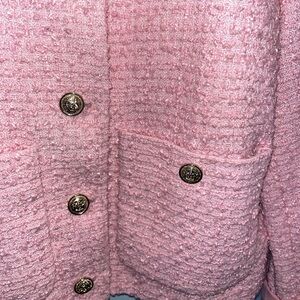 A pink cropped blazer with gold buttons and fully lined with pink on the inside.