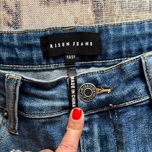 These flared jeans showcase a high-waisted design and a wider flare from the knee down, reflecting a retro 1970s style. The classic blue denim features a faded, worn-in look with noticeable distressed areas, including large rips across both knees, enhancing their casual vibe.