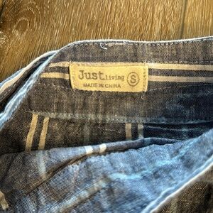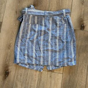 BLUE & WHITE STRIPE MOCK WRAP LINEN BLEND MINI SKIRT WITH TIE DETAIL SIZE SMALL WITH TWO BACK POCKETS PRE OWNED NO FLAWS