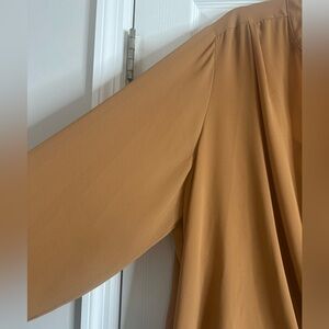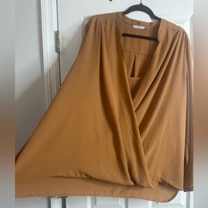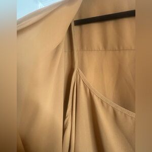This top is gorgeous in person! The material is lightweight, flowy and without stretch. The front has a crisscross neckline which is both comfortable and flattering. The camisole is built in for coverage and versatility. Great for work or looks sharp paired with jeans on a casual weekend. The neutral color is perfect for any season! It fits true to size and is in excellent condition from a clean, pet free, smoke free home.