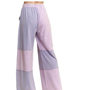 Stylish wide-leg pants with a colorblock design. Features shades of purple and pink. Comfortable and trendy.