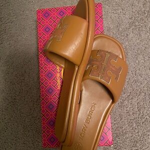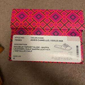 Tory Burch Double T Sports Slide Aged Camello/Gold Size 8