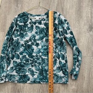 This long sleeve blouse by Liz Claiborne showcases a soft silver base adorned with large floral designs in teal and dark green. The bold abstract pattern creates a vibrant and nature-inspired aesthetic, perfect for casual outings.