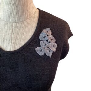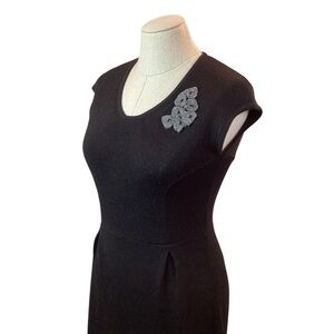 This elegant black dress features a chic floral detail, perfect for any occasion. Its classic design offers a timeless look.