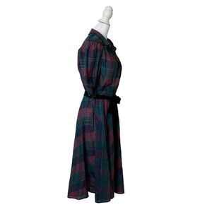 Millicent CA brand womens vintage (estimated 80s) multicolored plaid dress. Short puffer style sleeves. Fold down collar, buttons all the way up for multi-way wearing. Belted. US size 14, please verify your measurements below.