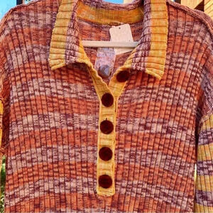 The perfect statement-making romper featured in a seriously soft, ribbed knit fabrication and slouchy silhouette with a colorful, space-dye striped pattern, oversized button front detailing, and bell-sleeves.