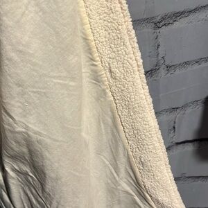 This is a super soft, lined, L.L. Bean Navy Blue Cardigan. It has a fleece hoodie and is cotton-lined. It has Toggle buttons. It is a wool/acrylic with 100% cotton lining which makes it both soft and warm. It’s in new without tags condition and comes from a clean, smoke-free home. It’s a size large and the approximate measurements are as follows: