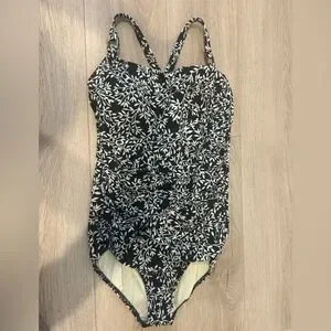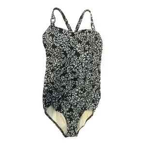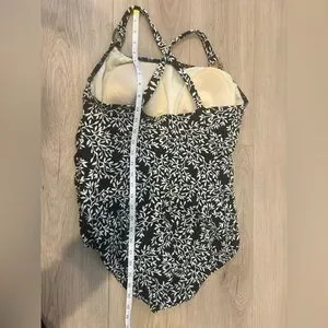 Lands' End Swimsuit Tank Plus 18W Padded Shelf Bra Side Ruching Black Leaf Print