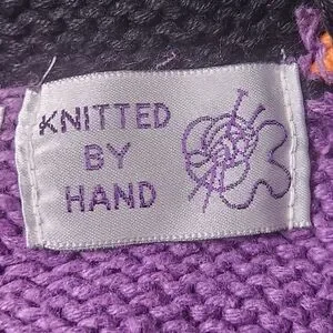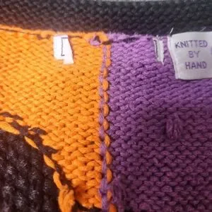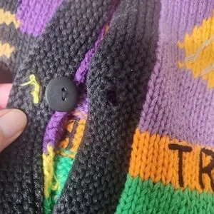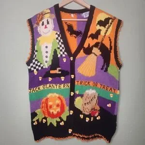 The coolest vintage Halloween sweater vest I have ever come across. The brand label is removed. The vest is knitted by hand. Crocheted candy corns cover hidden buttons underneath. It is really thick. A lot of love went into this.