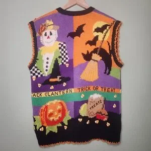 Vintage Halloween Sweater Vest XL Hand Knit Witchy Scarecrow Kitschy Teacher