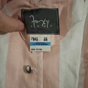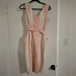 Charming sleeveless dress featuring vertical stripes. Button-down front detail with functional pockets. Includes matching belt with silver buckle. Fitted silhouette with v-neckline.