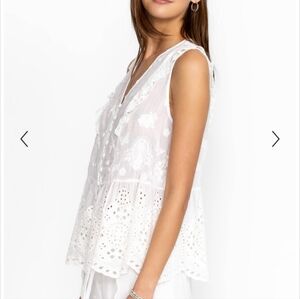 Designed from a breathable material, the Kit Anitta Tank brings a carefree spirit and a touch of whimsy to your warm-weather repertoire. Perfect for tropical destinations and sun-lit afternoons, this tank boasts a V-neck, a button front, a detailed embroidery, and scallop trims and ruffled shoulders for a fanciful finish. Pair with jeans and sandals for an effortless daytime ensemble.