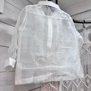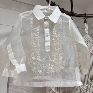 Hard to find small sized barong! So cute. Straight from Philippines. Worn to one event and then outgrew. So many compliments! Please notice the staining in photos from when my son was playing/eating. Have not attempted to clean, as I am unsure of care instructions for fabric and didn't want to ruin shirt, will allow buyer to have it cleaned.