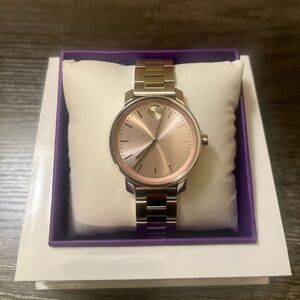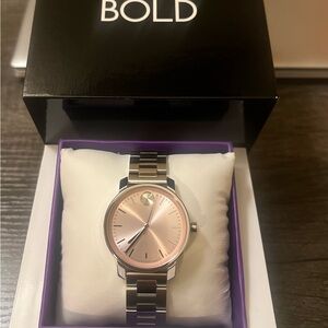 Brand new with tags attached is Women’s Movado Bold watch. Stainless steel/ silver tone with baby pink face. Very modern and stylish. Swiss quartz movement; 34mm face size. Comes in original Movado box.