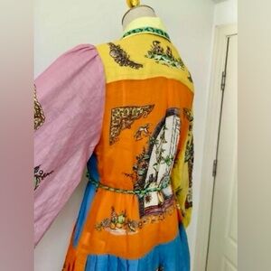 Experience the allure of peeking into other's lives with this whimsical maxi dress. Adorned with a sharp collar, puffed balloon sleeves, button cuffs, and a self-tying belt, this shirtdress features a multi-pattern colorblock design for a modern touch. The concealed placket with self-covered buttons and yoked back lend an elegant feel to the full length gathered skirt, effortlessly flattering your silhouette. Whether for a laid-back weekend trip or a lavish garden soiree, make a daring statement in this luxurious polyester dress.