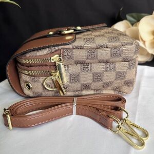 Stylish and practical, this brand-new crossbody bag is the perfect blend of fashion and function. The classic brown and tan argyle pattern adds a timeless touch and gold-tone hardware, making it suitable for any occasion. 100% vegan leather exterior and 100% polyester interior. Designed for versatility, it features:
