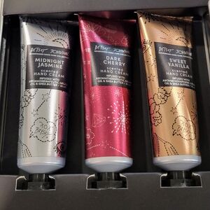6x 5 rhinestone Studded collectible Betsy Johnson tin with 3 (brand new, not opened) hand creams, midnight jasmine, Dark cherry, sweet vanilla. Creams infused with Aromatherapeutic argon oil and Shea butter.