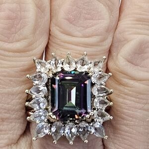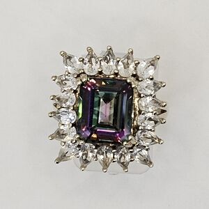 This is a bold and stunning ring. The cut of the topaz is incredible and really makes the colors very vivid. It is crafted of 18kt gold-embraced solid sterling silver. Size 10