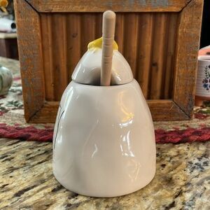 🌎 Rae Dunn HONEY Pot with Wooden Dipper Large Letter Yellow Bee on Lid