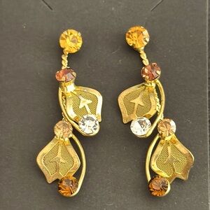 Dangly Gold Tone Mesh Leaf Pierced Earrings w Orange & Clear Rhinestone Accents