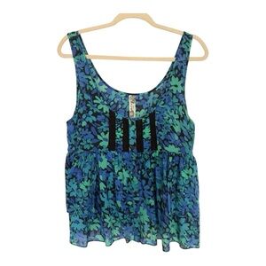 Free People Vibrant Aqua Blue Floral Print Sleeveless Cotton Blend Tank Top-Sz L