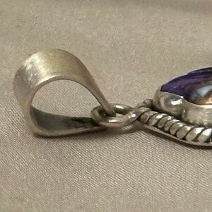 NWOT - 925 Sterling Silver, Purple Dahlia/Purple Copper Turquoise/Purple Copper Oyster Turquoise/Kingman Purple Dahlia Turquoise cactus pendant. Deep purple, copper streaking, white & light purple. Bezel set w/large bail. Frame has small beads around bottom half. Twisted rope style on top.