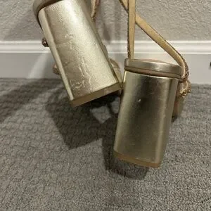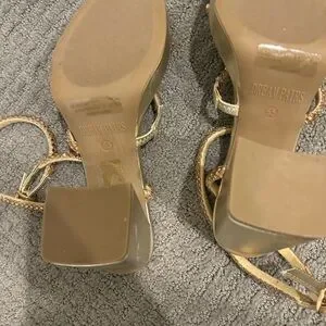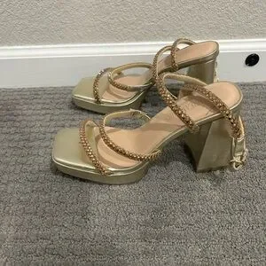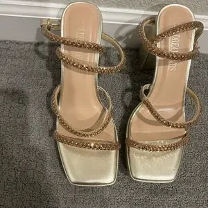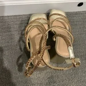 Gold strappy sandal heels with jeweled straps! Square toe and chunky heel. Perfect for any occasion. Never ended up wearing. A few indentations on back of heel from traveling, but never ended up wearing! Open to reasonable offers🩷